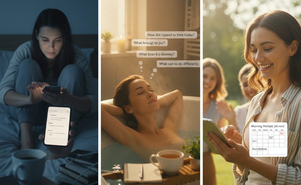 次に取り入れたのが「自分への問いかけ」タイム。夜、お風呂に入りながら「今日は十分に体を動かせたかな?」「ちゃんとリラックスできた?」と、その日の過ごし方を振り返ります。お風呂は体を温めながら心も温まる、まさに至福の時間。この習慣を始めてから、自律神経のバランスが整ってきたような気がします。